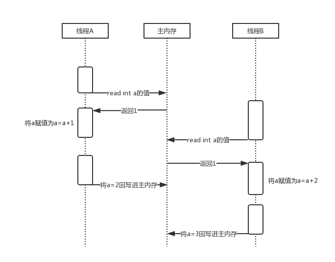 根据上面java内存模型定义中可以看到,java对象的数据都是在主内存中,每个线程要去使用的时候,首先要通过read-load操作,将主内存的数据加载到工作内存中,成为一个数据副本,后面线程执行引擎使用的时候,通过use-assign操作从工作内存中将变量副本加载出来用于栈上计算,用完后通过store-write操作将工作内存中的数据回写到主内存中。整个过程如果不做并发控制,用最基本的两个线程对同一个主内存数据操作来举例说明: