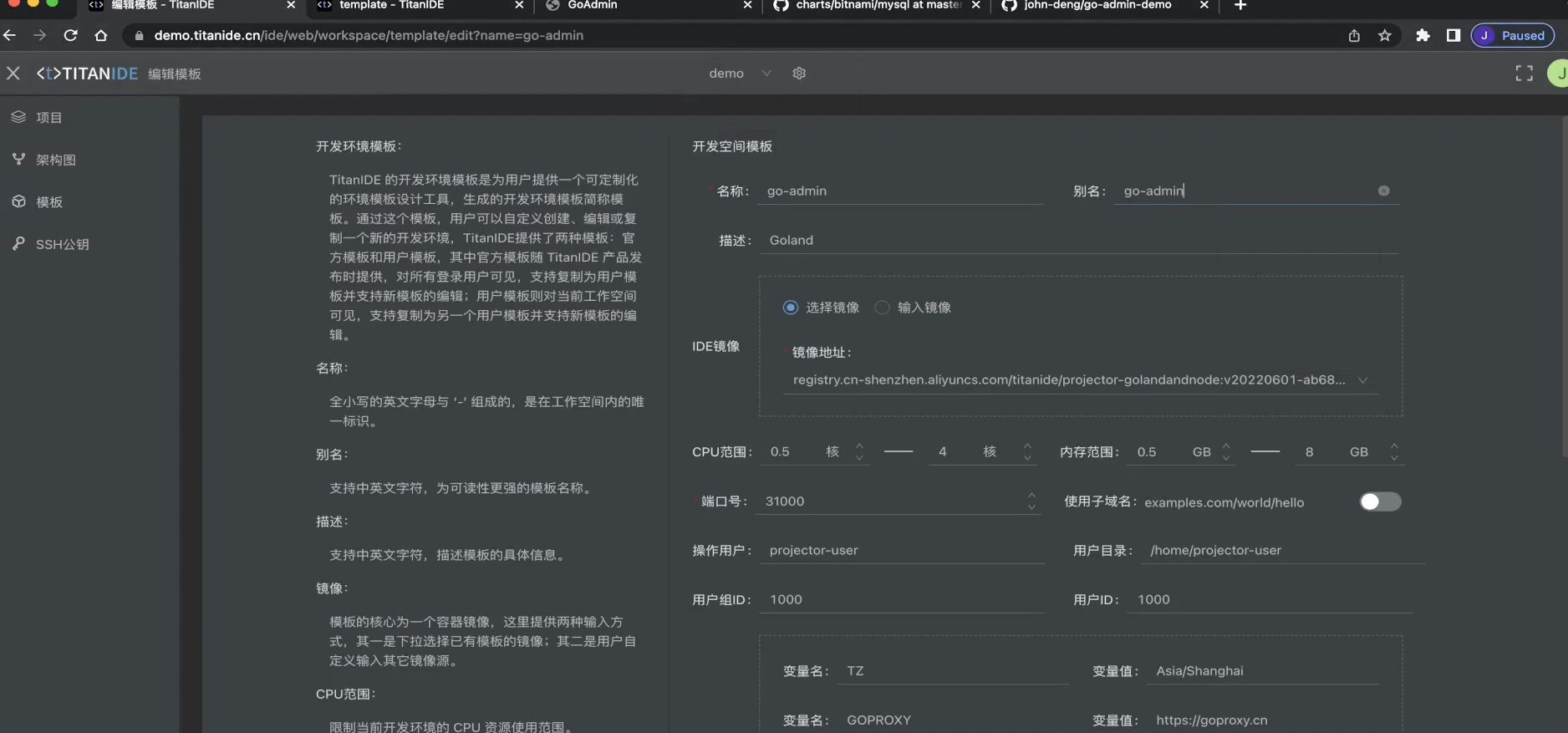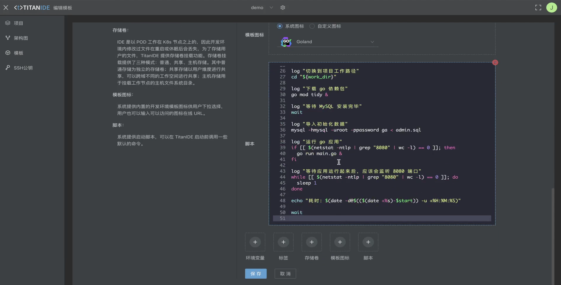 我们来复制一个 Gloand 基础模板到我的工作空间,我们就叫 Go Admin,然后编辑这个 Go Admin 模板,添加一个脚本块,粘贴刚才调试好的脚本并保存,一个 [TitanIDE] 深度定制模板新鲜出炉了,快分享给您的团队小伙伴来体验吧!