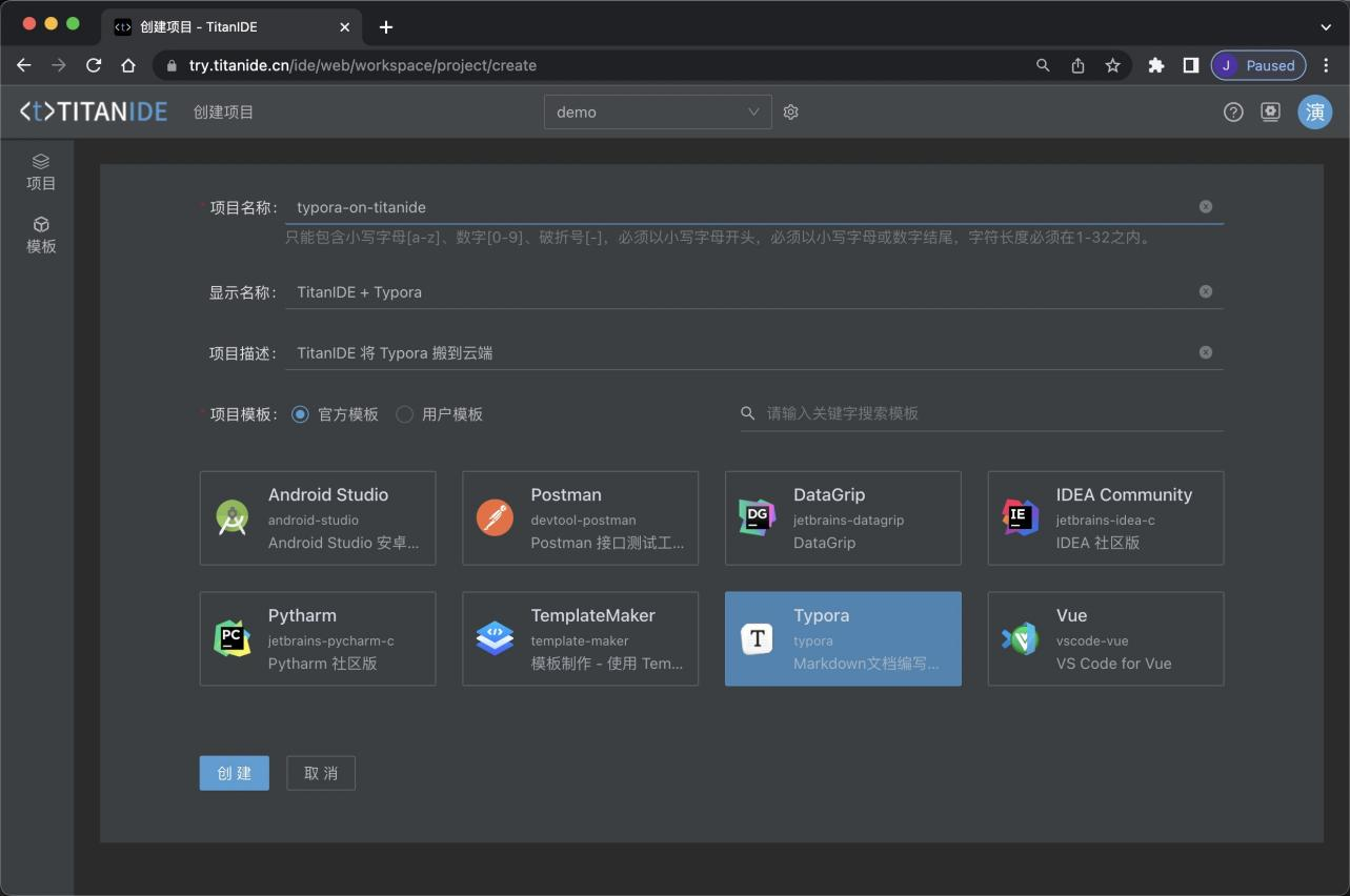 在安装好 TitanIDE 之后,通过自带的模板制作工具 TemplateMaker 创建一个项目,选择 TemplateMaker 模板创建一个项目 template-typora, 目的是制作一个容器镜像。