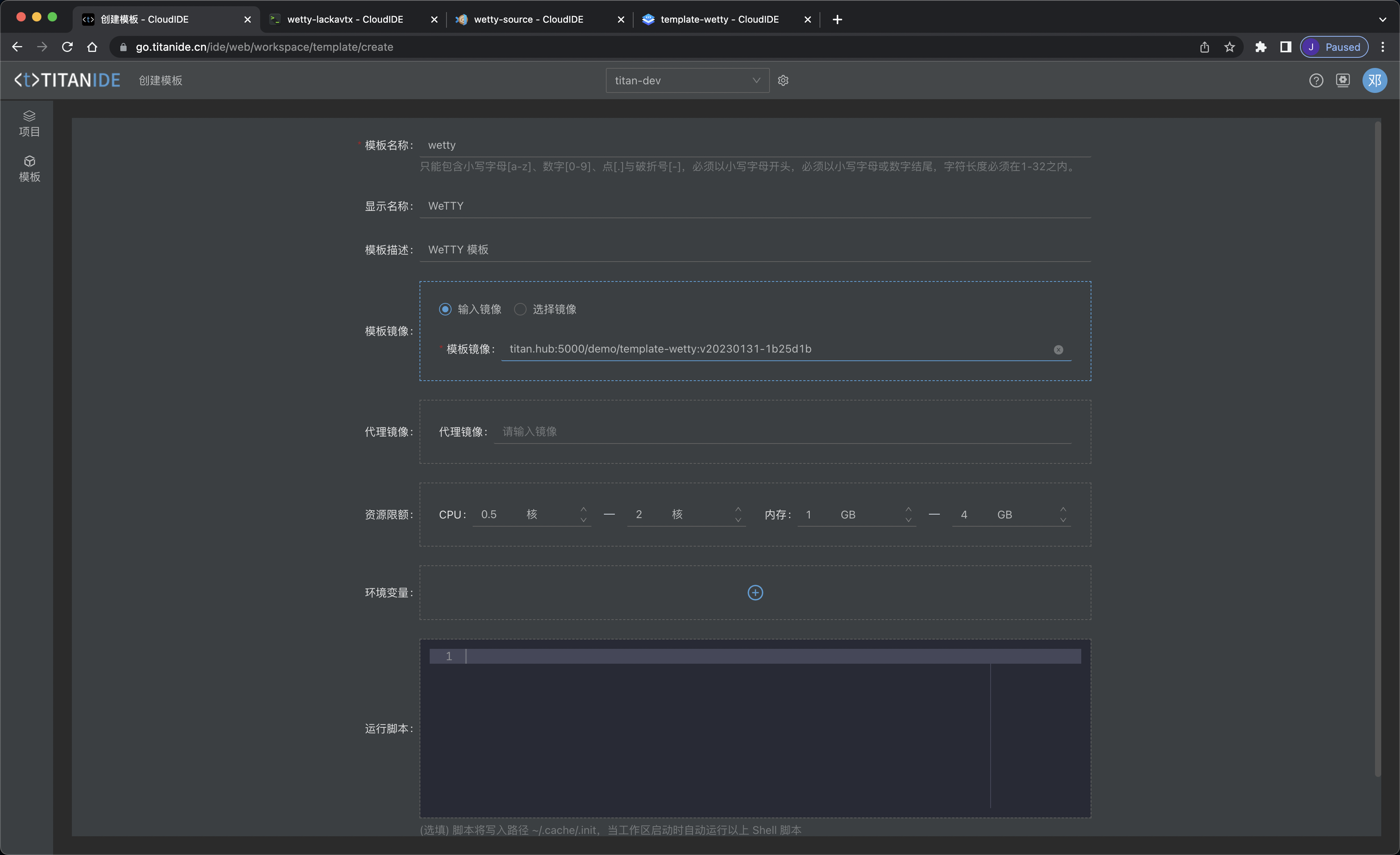 然后使用 WeTTY 模板镜像 titan.hub:5000/demo/template-wetty:v20230131-1b25d1b 创建 WeTTY 模版: